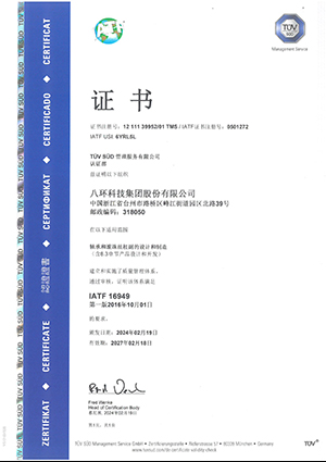 2013年和2016年先后通过德国TUV的ISO/TS16949:2009质量体系换证审核和浙江省环科环境认证中心的 SO14001环境体系换证审核。